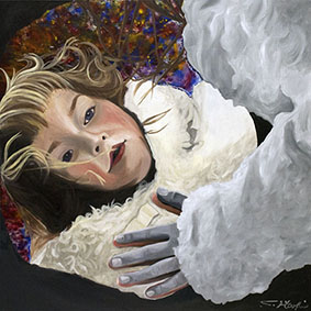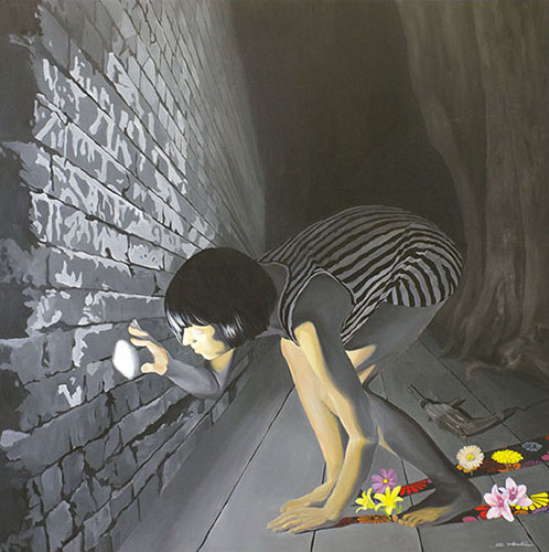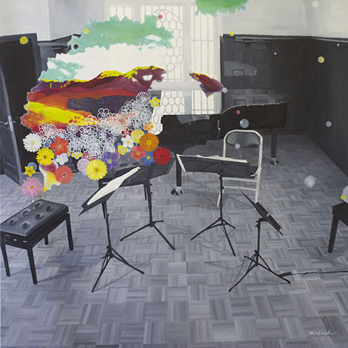 Der 1977 in Japan geborene Künstler Satoshi Hoshi, der sich gerne von Träumen inspirieren lässt und in Gustav Klimt und Ross Bleckner seine künstlerischen Vorbilder sieht, siedelt seine Kunst zwischen Realität und Fantasie an. Er vermittelt seine abstrakten Visionen durch konkrete Objekte, die er in seiner vielschichtigen Maltechnik umsetzt. Er verwendet dazu beispielsweise japanische Blumenmuster, die er ganz unterschiedlich kombiniert und dadurch verschiedenen Motiven neue Bedeutung verleiht. Satoshi Hoshi sucht oft in Zeitschriften nach Bildern, die für ihn in einem Zusammenhang mit seinen abstrakten Vorstellungen stehen. Er setzt sich dann intensiv mit dem Bildmaterial auseinander und die Bildidee entsteht aus der Verschmelzung von eigener Vision und den neu gewonnenen Eindrücken. Nach und nach werden die Details klarer und die Motivation größer, diese darzustellen. Er formuliert selbst sehr prägnant: „Die wesentliche Arbeit passiert, bevor man zum Pinsel greift. Wichtig sind Visionen aber auch der Wille, diese Visionen darstellen zu wollen.“