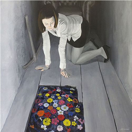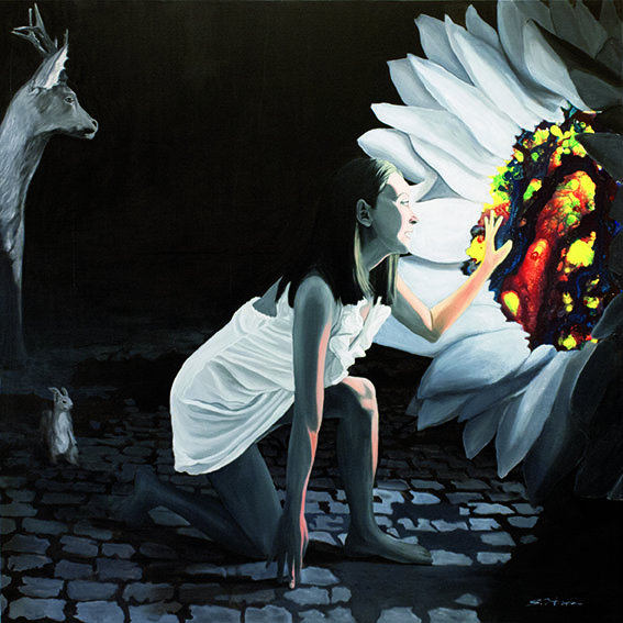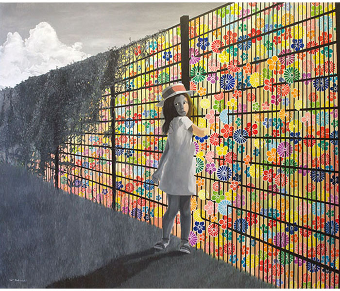 Der 1977 in Japan geborene Künstler Satoshi Hoshi, der sich gerne von Träumen inspirieren lässt und in Gustav Klimt und Ross Bleckner seine künstlerischen Vorbilder sieht, siedelt seine Kunst zwischen Realität und Fantasie an. Er vermittelt seine abstrakten Visionen durch konkrete Objekte, die er in seiner vielschichtigen Maltechnik umsetzt. Er verwendet dazu beispielsweise japanische Blumenmuster, die er ganz unterschiedlich kombiniert und dadurch verschiedenen Motiven neue Bedeutung verleiht. Satoshi Hoshi sucht oft in Zeitschriften nach Bildern, die für ihn in einem Zusammenhang mit seinen abstrakten Vorstellungen stehen. Er setzt sich dann intensiv mit dem Bildmaterial auseinander und die Bildidee entsteht aus der Verschmelzung von eigener Vision und den neu gewonnenen Eindrücken. Nach und nach werden die Details klarer und die Motivation größer, diese darzustellen. Er formuliert selbst sehr prägnant: „Die wesentliche Arbeit passiert, bevor man zum Pinsel greift. Wichtig sind Visionen aber auch der Wille, diese Visionen darstellen zu wollen.“