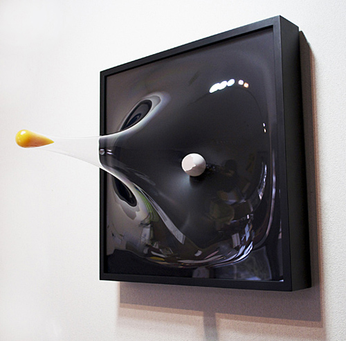 松枝の作品は、卵の殻と黄身、目の検査表のマーク(日本ではCのマークを使用)、標識など、日常のなかでよく目にするモノに松枝は着目し、そのモノに命を吹き込んだらいったいどんな動きをするのか、という発想から作品が生まれていきます。作品を制作するうえで常に頭に置いていることは、「ワードレス」、「エスケープ」、「ポジティブ」という3つキーワードです。説明がなくてもぱっと見てわかる事、マークやシンボルそのものが飛び出すことによって意味以上の意味を持たせること、驚きや楽しさをみている観客が感じる事。それが作品を制作するうえで主軸となっているコンセプトです。