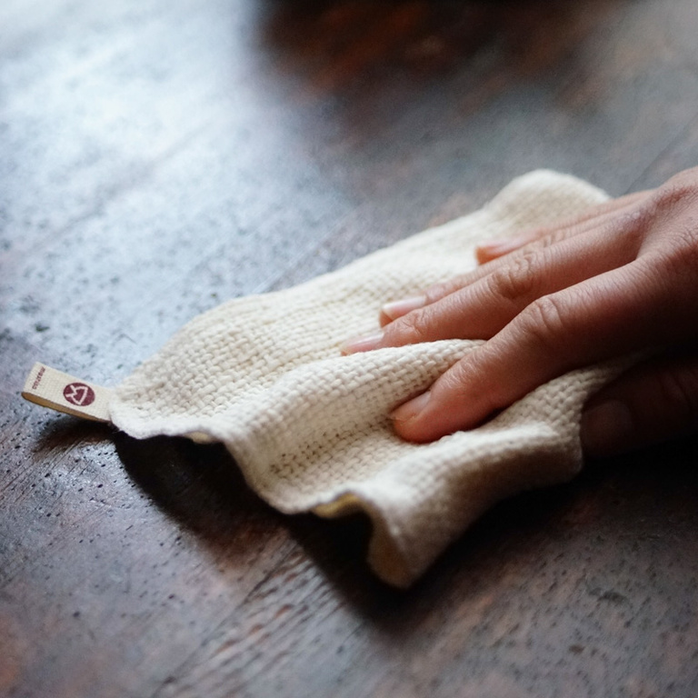 Das Garn ist mit der traditonellen japanischen Garabo-Technique gewonnen. Der Einzigartige Struktur und die Unregelmäßigkeit der Fäden bringt eine besonders gute Schmutzaufnahmefähigkeit. Trotzdem ist es sehr weich auf dem Haut.